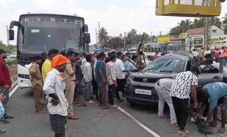 ಎಕ್ಸ್​ಪ್ರೆಸ್ ಹೈವೇಯಿಂದ ಎಕ್ಸಿಟ್ ಆಗುವಾಗ ಕಾರು ಚಾಲಕನಿಗೆ ಗೊಂದಲವಾಗಿದೆ. ಹೀಗಾಗಿ ಮತ್ತೆ ಎಕ್ಸ್​ಪ್ರೆಸ್ ಹೈವೇಗೆ ಚಾಲಕ ಕಾರು ತಿರುಗಿಸಿದ್ದಾರೆ. ಈ ವೇಳೆ ಹಿಂದಿನಿಂದ ವೇಗವಾಗಿ ಬರುತ್ತಿದ್ದ ಕೆಎಸ್​​ಆರ್​ಟಿಸಿ ಐರಾವತ ಬಸ್ ಡಿಕ್ಕಿ ಹೊಡೆದಿದೆ.
