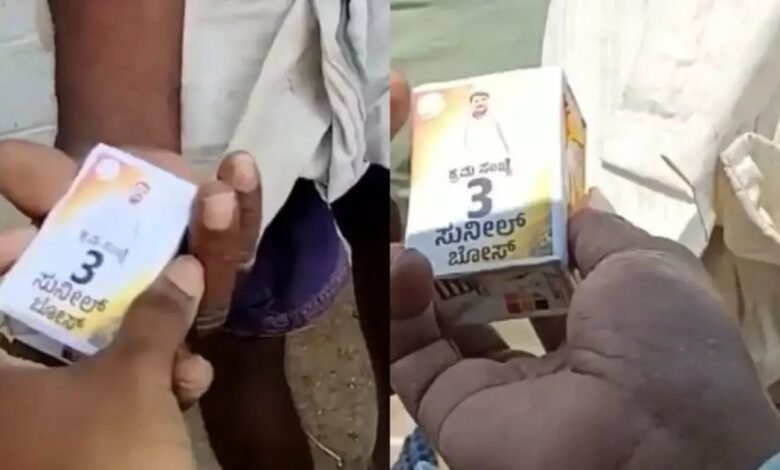 ಮದ್ಯದ ಪೌಚ್ ಗಳ ಮೇಲೆ ಚಾಮರಾಜನಗರ ಕಾಂಗ್ರೆಸ್ ಅಭ್ಯರ್ಥಿ ಪೋಟೋ ವೈರಲ್