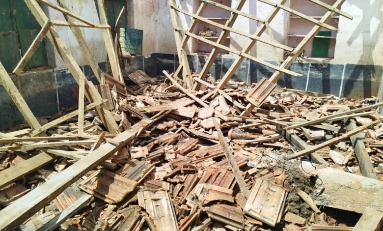 ಕೆ.ಆರ್.ಪೇಟೆ: ಸೋಮವಾರ ಮದ್ಯಾಹ್ನದಿಂದ ಸುರಿದ ಭಾರಿ ಮಳೆಗೆ ಕೆ.ಆರ್.ಪೇಟೆ ತಾಲೂಕಿನ ಬೂಕನಕೆರೆ ಹೋಬಳಿಯ ಬಳ್ಳೇಕೆರೆ ಗ್ರಾಮದ ಸರ್ಕಾರಿ ಹಿರಿಯ ಪ್ರಾಥಮಿಕ ಶಾಲೆಯ ಮೇಲ್ಚಾವಣಿ ನೆಲಸಮಗೊಂಡು ಉಳಿದ ಕೊಠಡಿಗಳು ಕೂಡ ಶಿಥಿಲಗೊಂಡಿವೆ ಎಂದು ಶಾಲಾ ಎಸ್.ಡಿ.ಎಂ.ಸಿ ಅಧ್ಯಕ್ಷ ಕಿರಣ್ ಆರೋಪಿದರು.